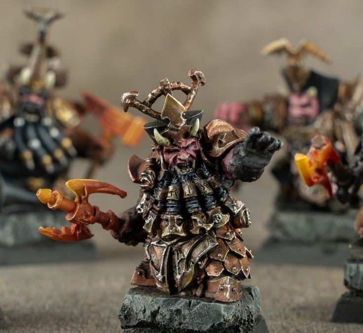 The hallmark of these painted Warhammer models is the heavily textured metallic armor. Each plate was layered with deep copper tones and shaded with dark oils to create a sense of ancient, soot-stained gear. The contrast between the matte charcoal beards and the semi-satin finish of the bronze creates a professional, high-end look suitable for a premium gaming collection.