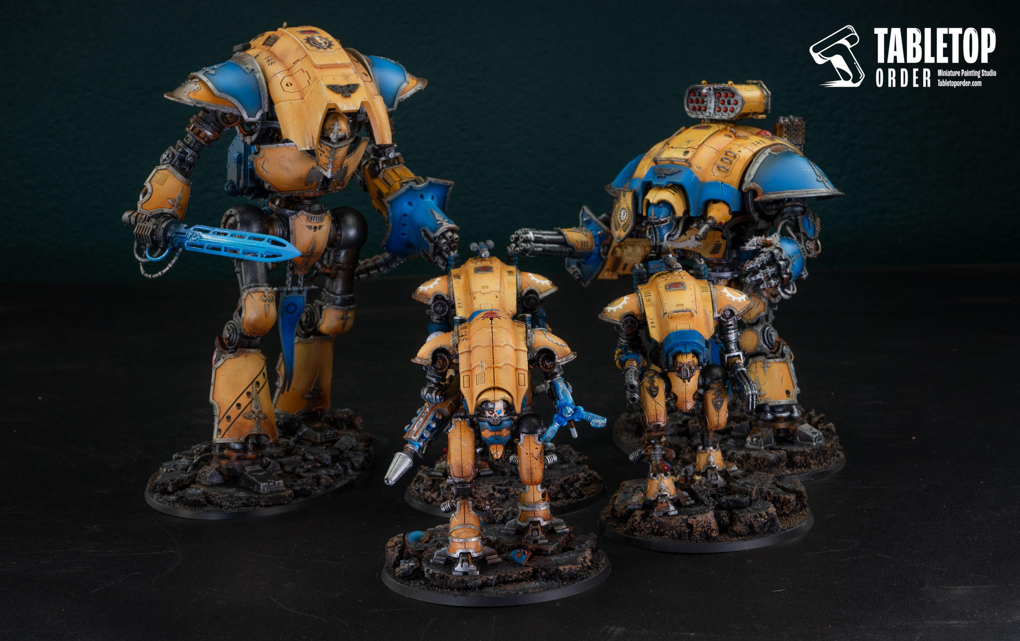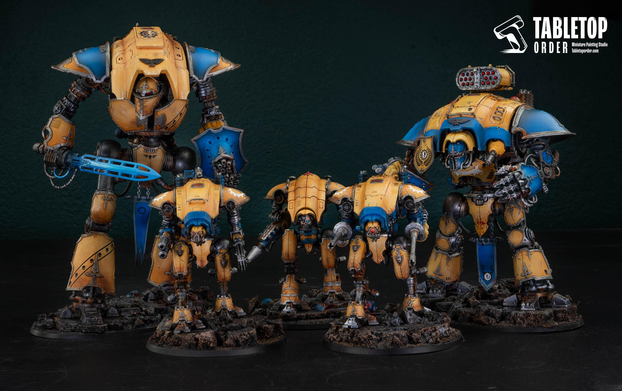 This custom painted Imperial Knights army project showcases a striking yellow and blue paint scheme, unified across different scales of war machines.