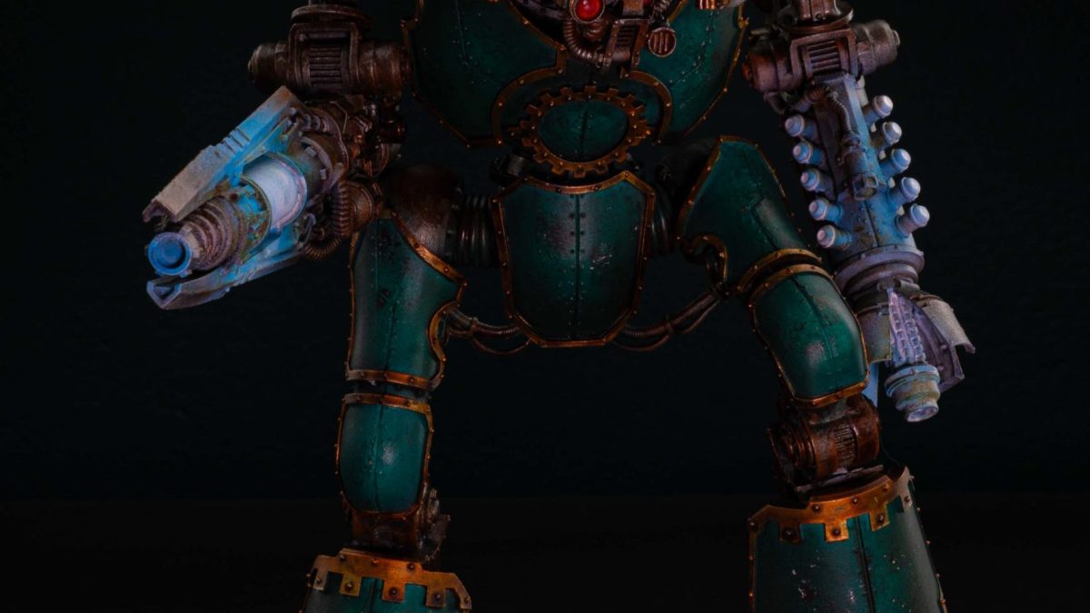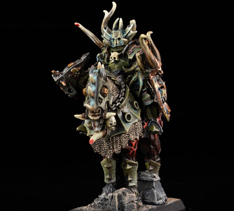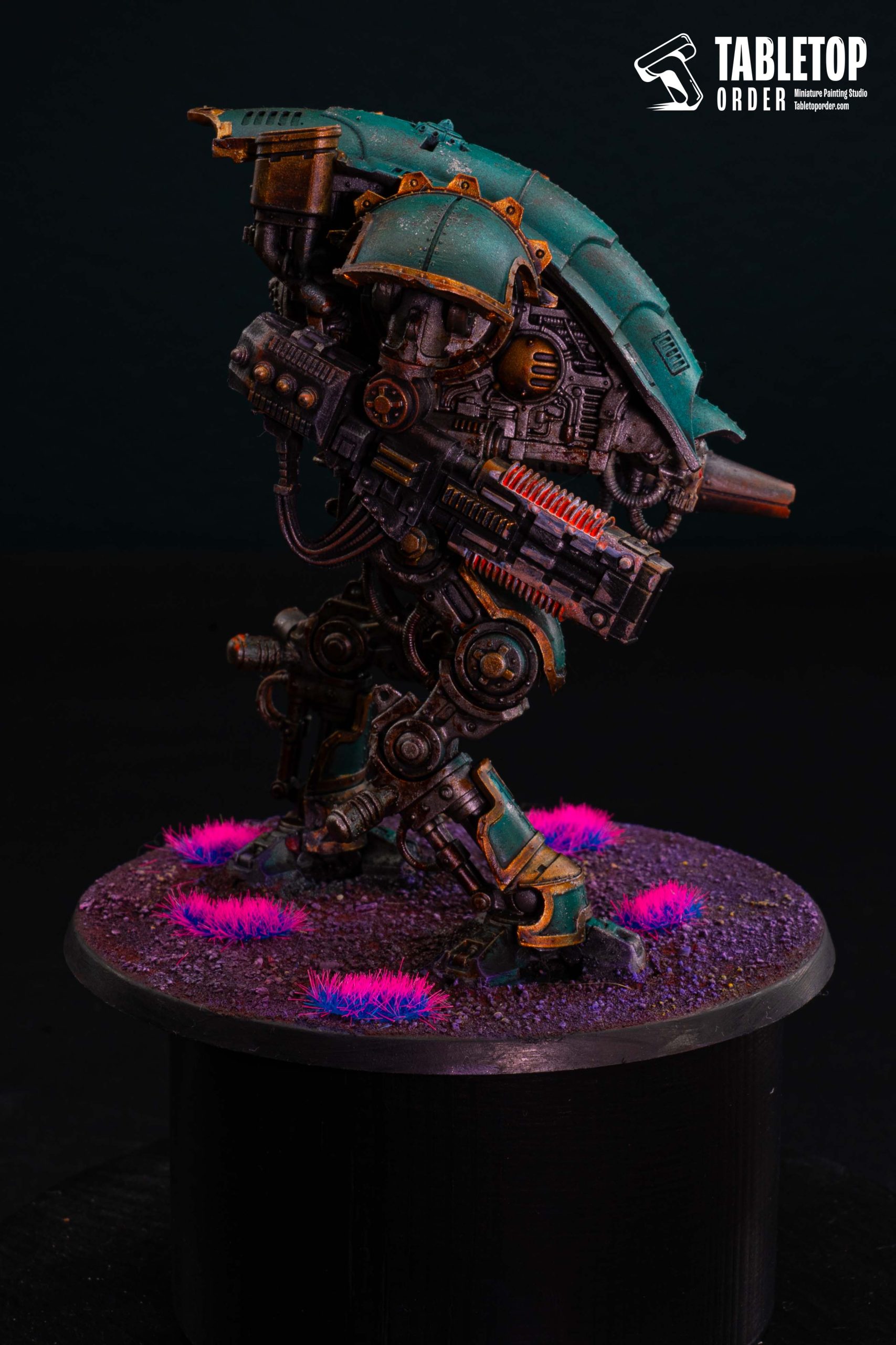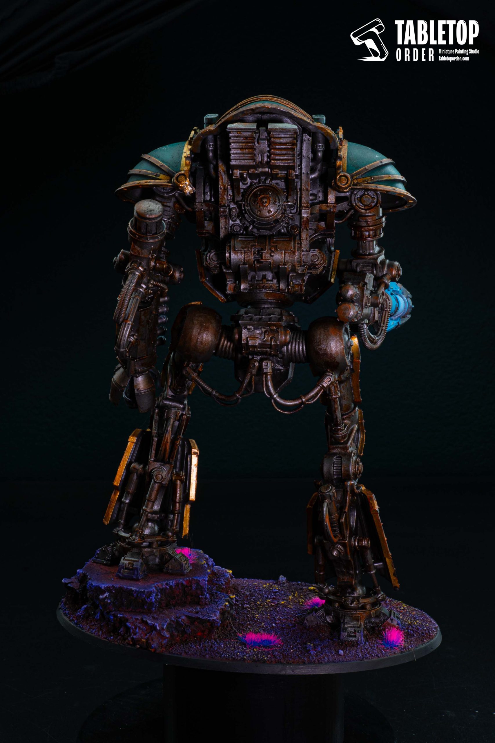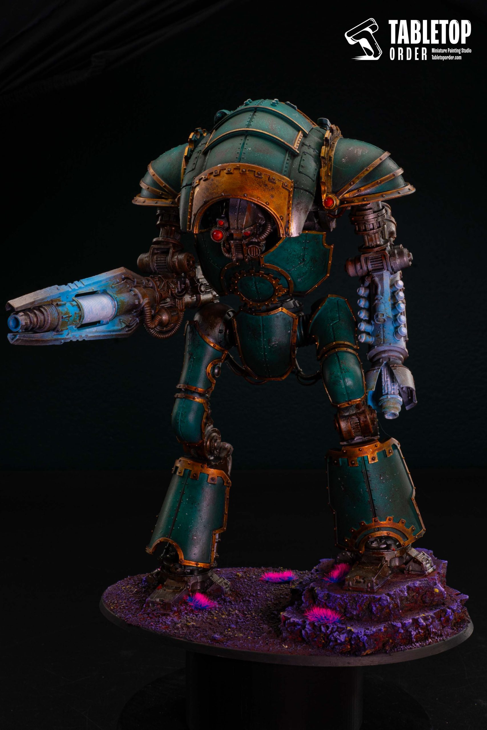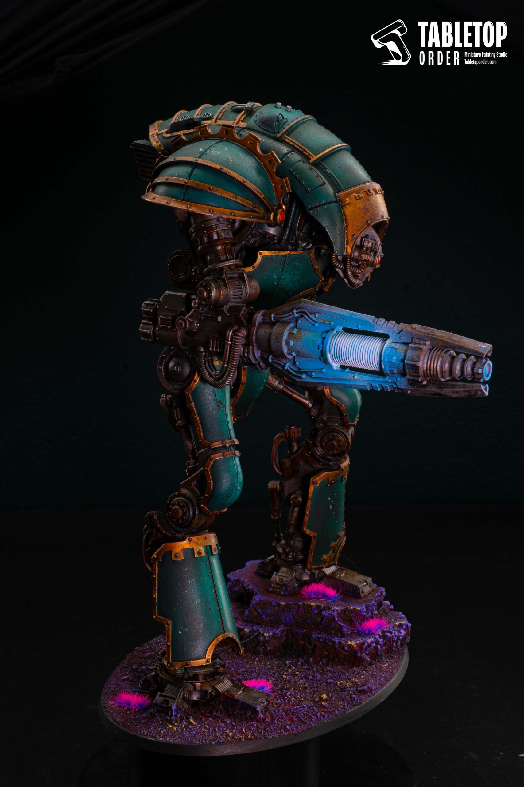 For this commission painting project, our miniature painting studio adopted a heavy Grimdark style, focusing on a deep, weathered teal armor paint scheme.