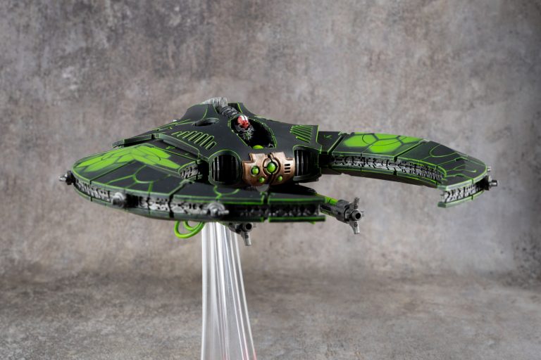 The silhouette of the Doom Scythe is unmistakable, and our miniature painting service worked to emphasize its crescent-shaped design through sharp, neon highlights along every panel line. The pilot, a skeletal Necron Immortal, has been detailed with a striking red head-stripe to provide a small but vital point of contrast within the green and black palette. This attention to detail ensures that the custom painted [faction] flyer feels like a part of a larger, cohesive force. For any commission painted Warhammer army, maintaining this level of consistency across both infantry and heavy vehicles is key to achieving a professional and immersive collection.