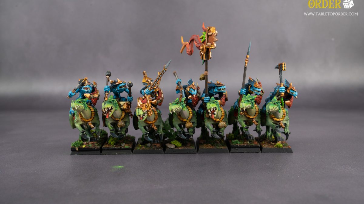 The models feature blue-skinned Saurus riders mounted on vivid green Cold Ones, creating strong color contrast that makes the unit visually distinctive on the tabletop.