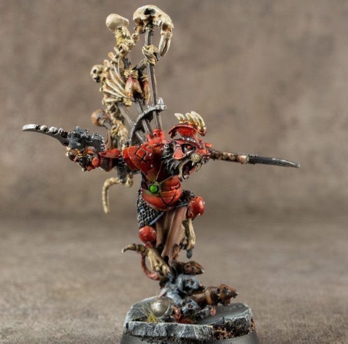 This custom painted Skaven Clawlord represents the pinnacle of Skaven treachery and martial prowess. For this commission painting project, our miniature painting studio focused on a vibrant red armor paint scheme, which serves as a classic mark of the Clan Verminus.